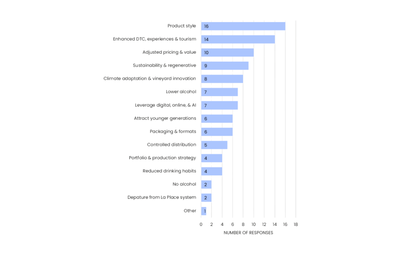 The most cited opportunity is a renewed focus on product style, respondents often referencing a fresher, more “drinkable” wines, approachable in their youth (16 responses):